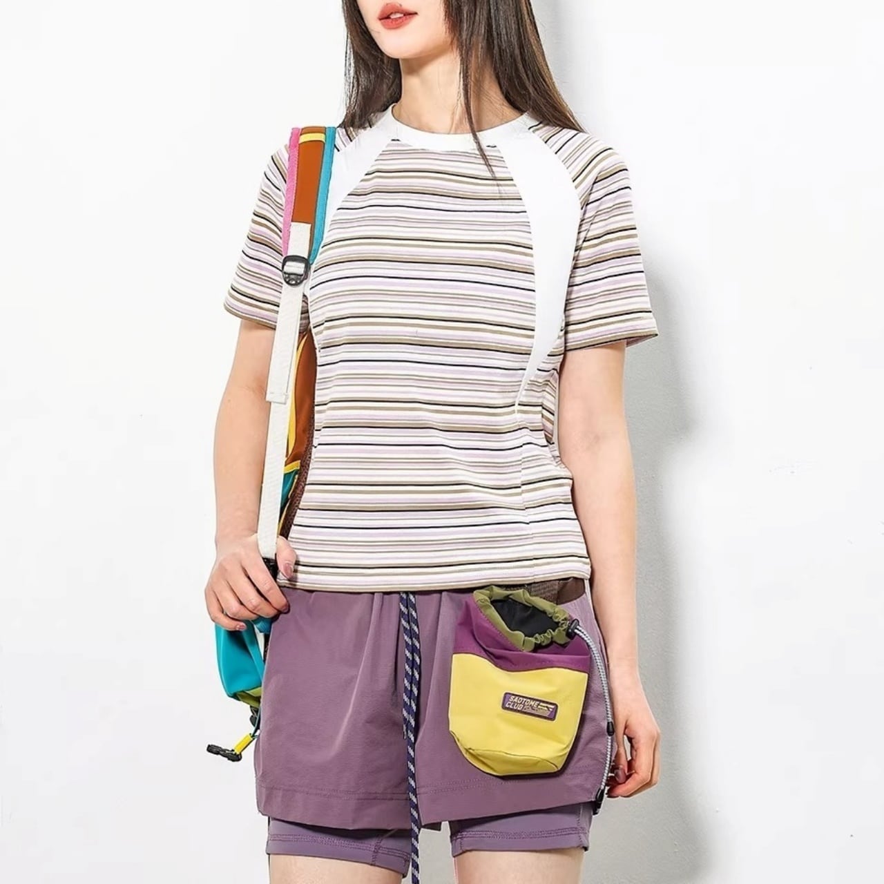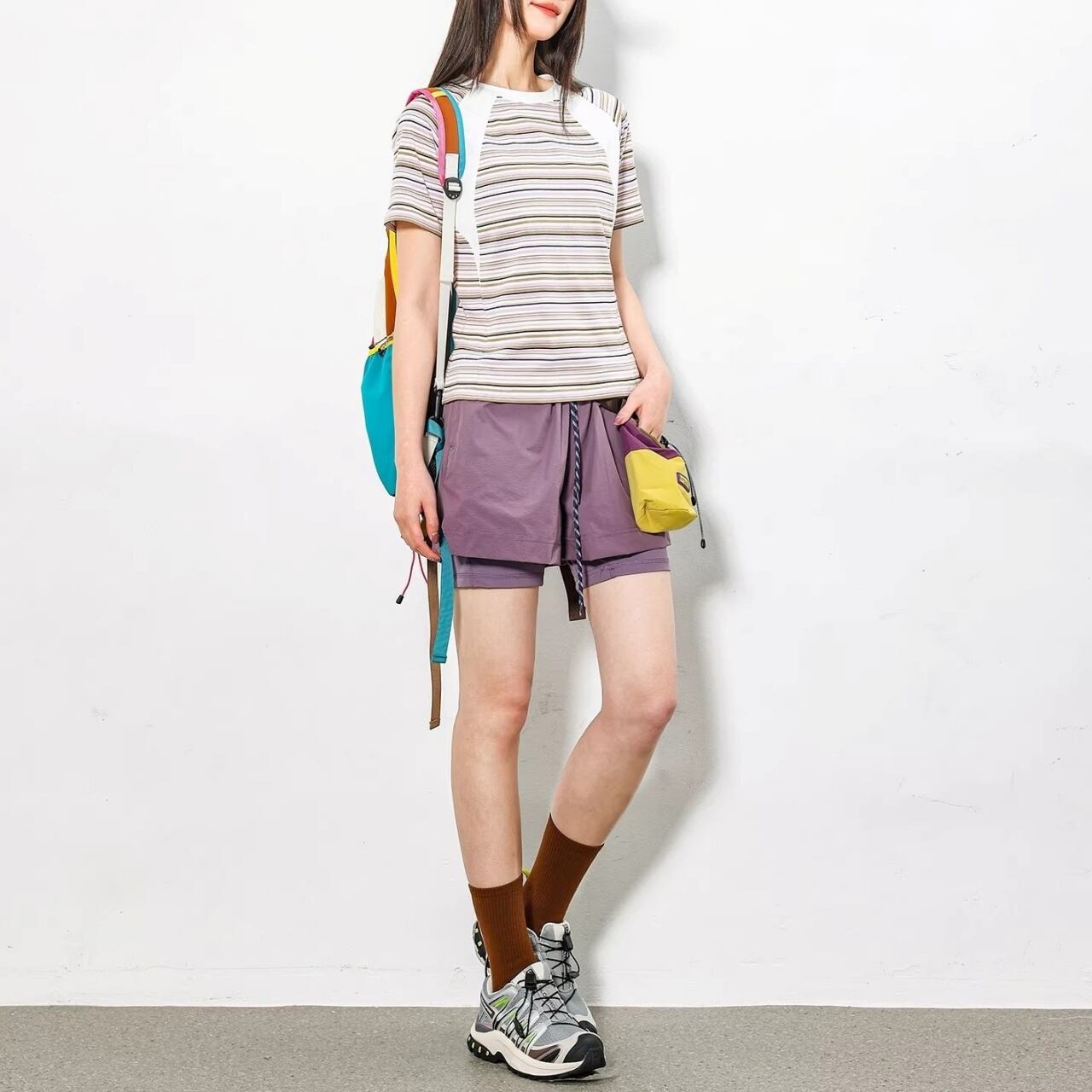 アクティブなショートパンツやキャップと合わせれば、都会的なアウトドアスタイルの完成。